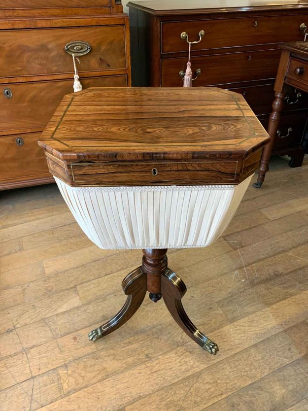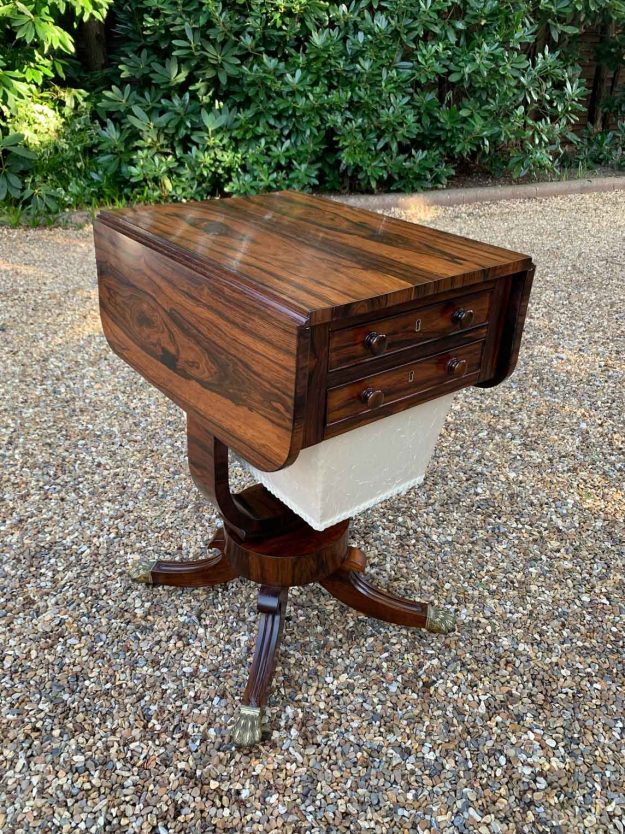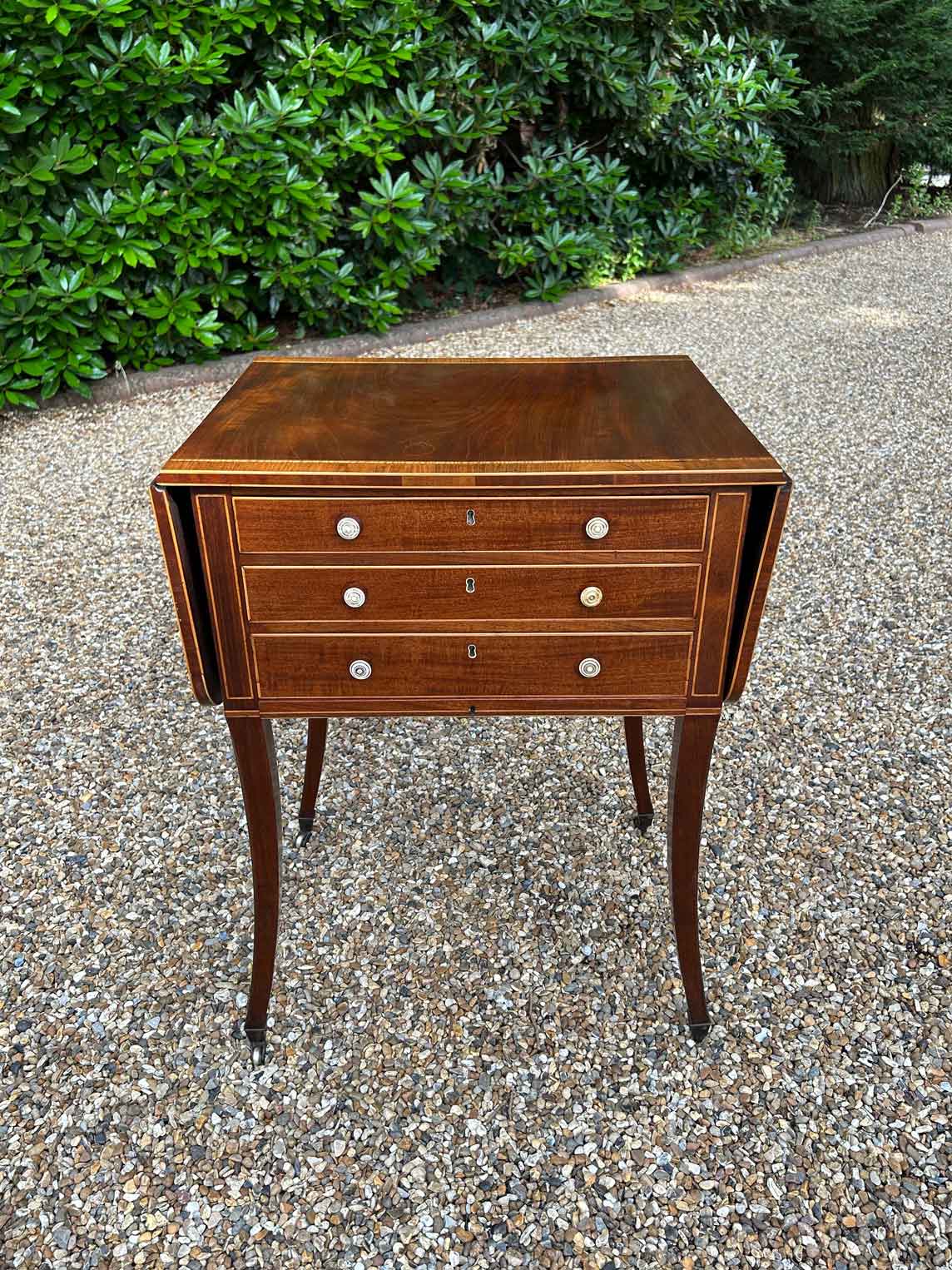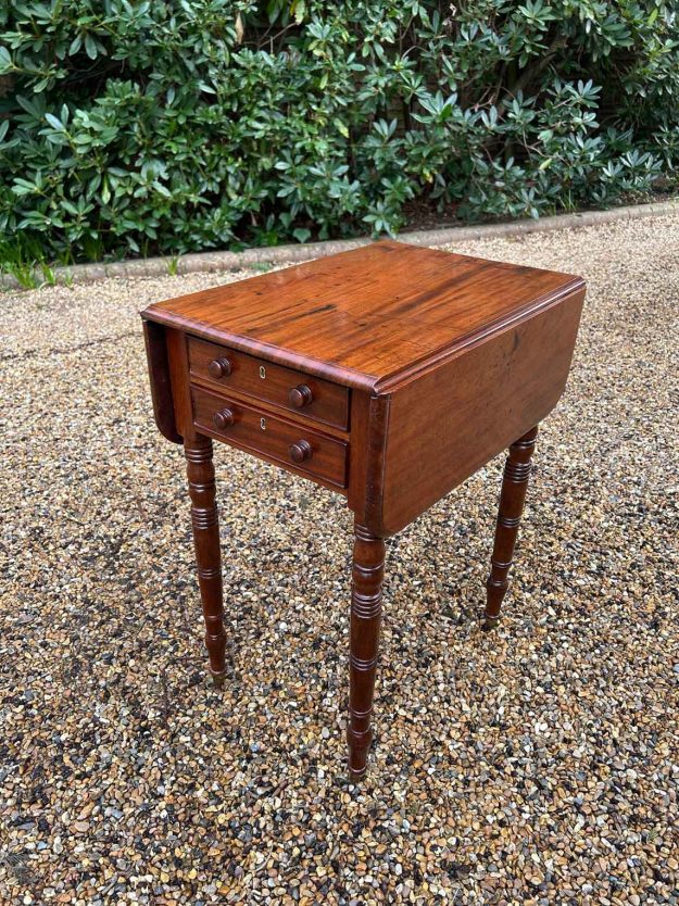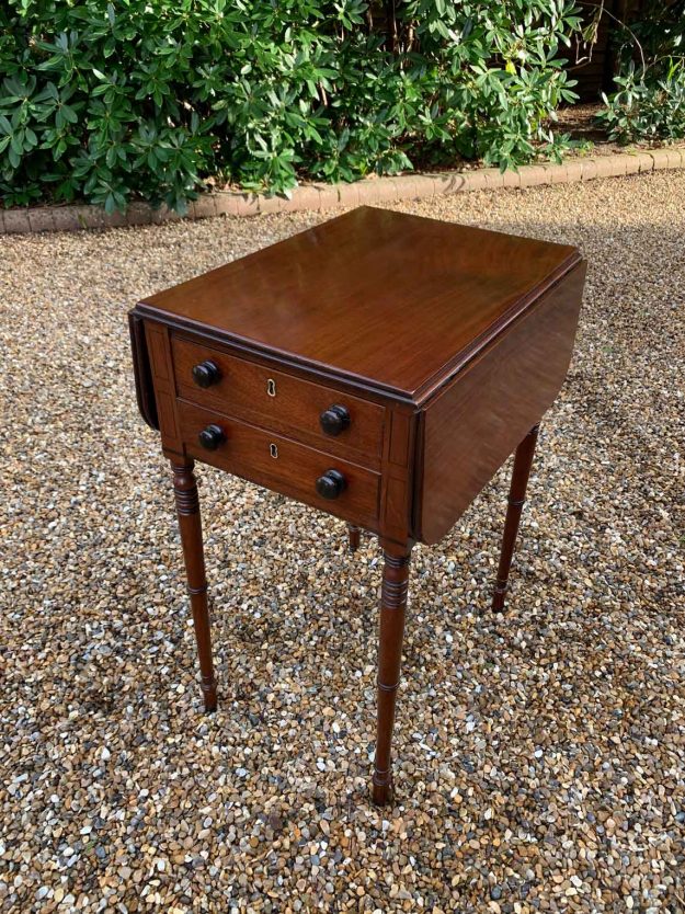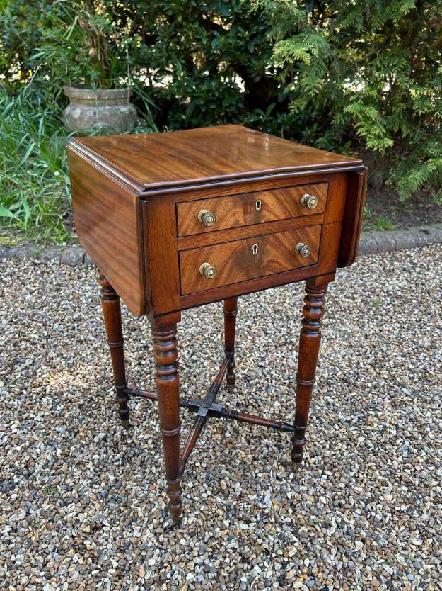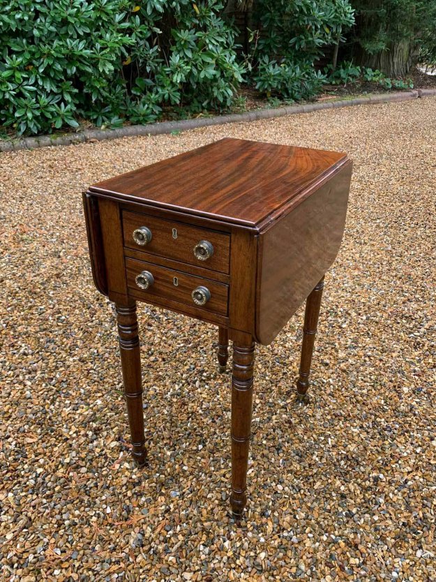 19th Century Georgian Mahogany Drop Leaf Work Table, fitted with two mahogany lined drawers with dummy drawers to back, bun handles, raised on turned legs. Circa: 1820 Dimensions: Height: 28 inches – 70.5 cms Depth: 21.5 inches – 54 cms Width: 15 inches – 39 cms Width Open: 30.5 inches – 77 cms Reference: DLWT2003 POA